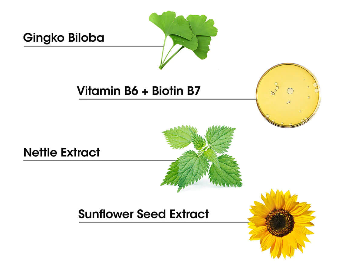 Featuring Vitamin B-6, Biotin B-7, Gingo Biloba, Nettle Extract and Sunflower Seed Extract.