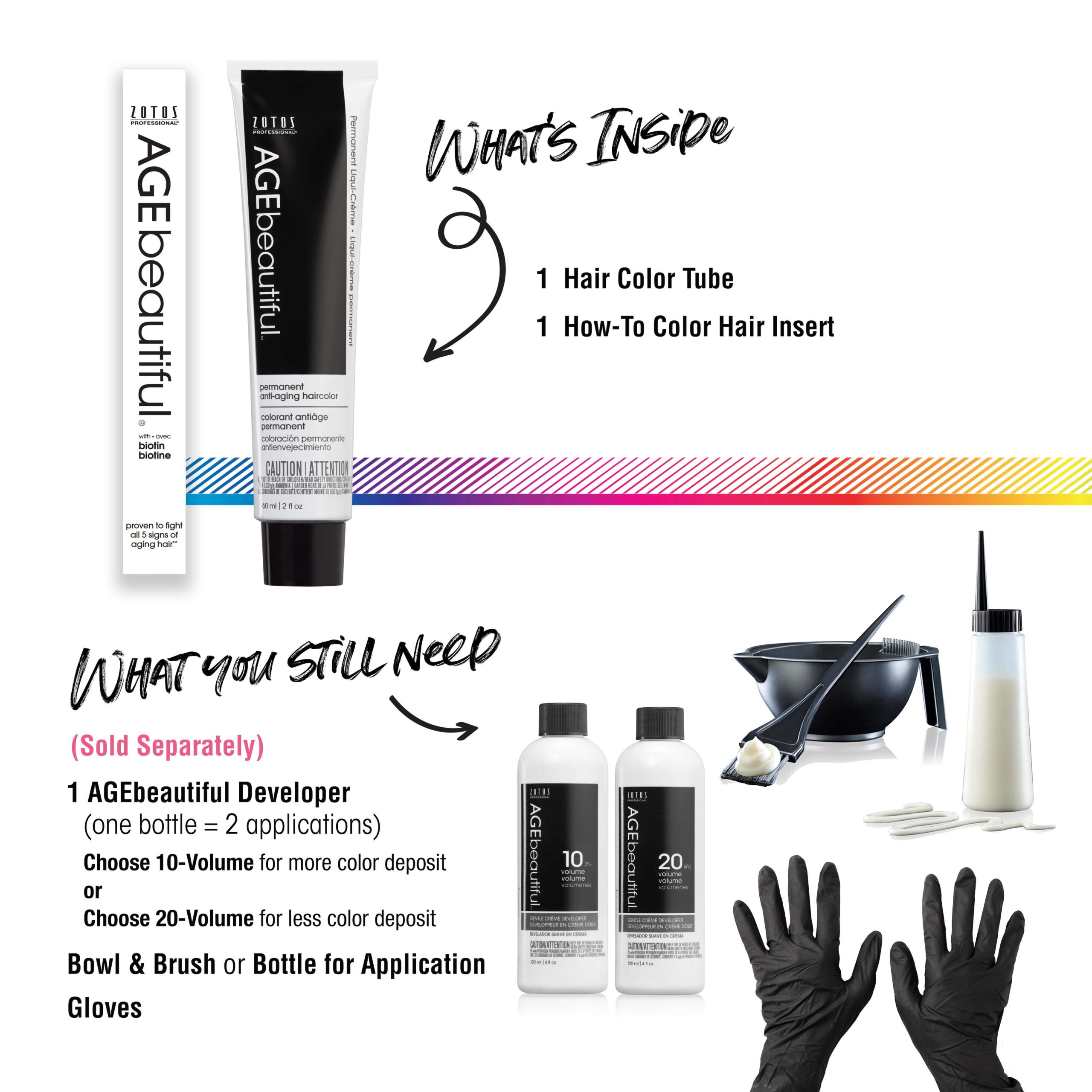 Mixing and Application: AGEbeautiful® Topcoat Toners can be mixed using a bowl and brush and/or applicator bottle. AGEbeautiful® Topcoat Toner is mixed 1:1 (Equal parts AGEbeautiful® Topcoat Toner and AGEbeautiful developer 10 or 20 volume.) Pour 2 oz. of developer into applicator bottle or bowl (approx. ½ of the developer provided). Pour entire 2 oz. tube of color into applicator bottle or bowl. Mix well. Apply topcoat toner.