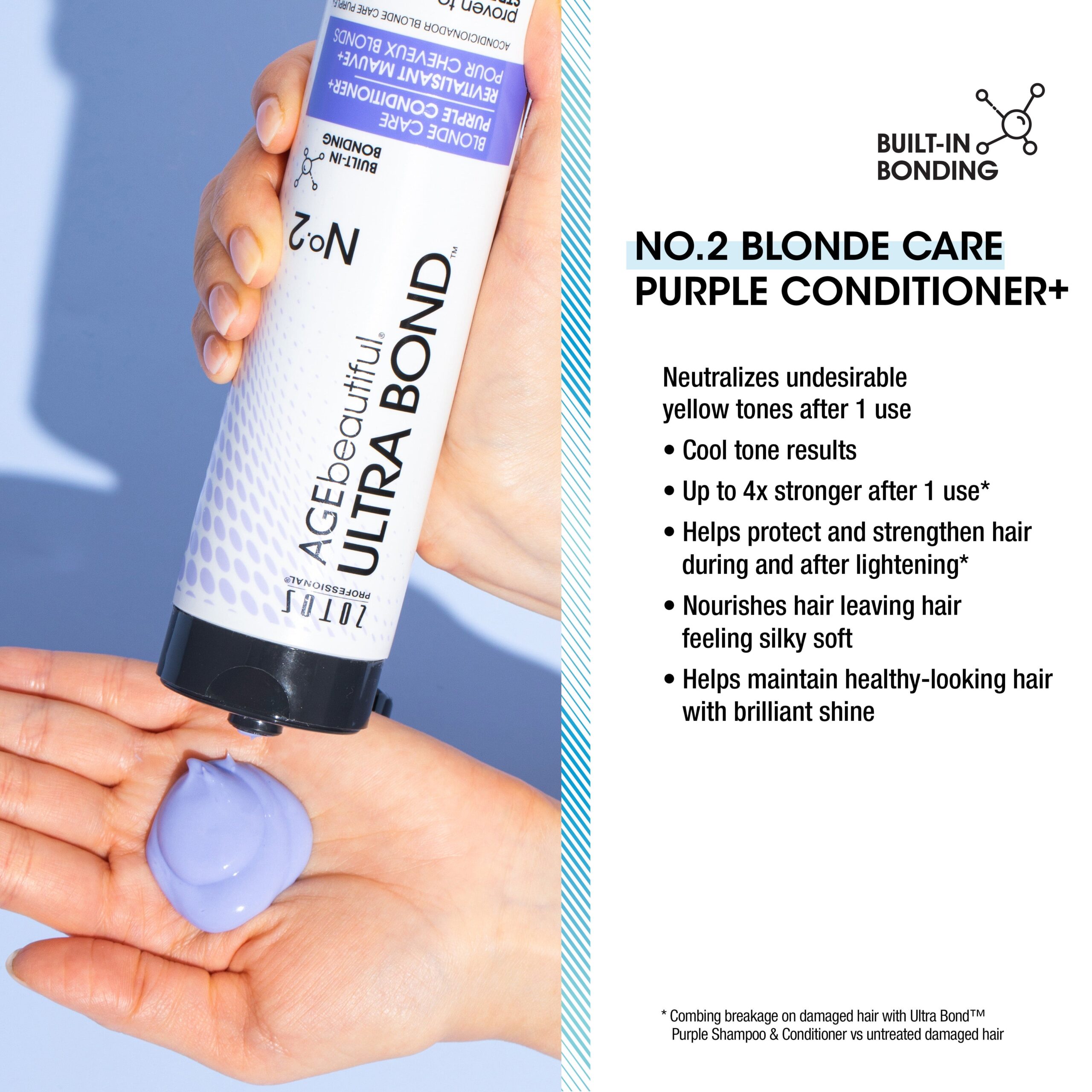 - Use Agebeautiful® Ultra Bond™ Purple Shampoo+ & Condition+ to maintain cool toned blondes in between lightening.